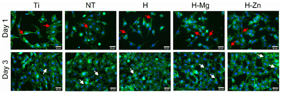According to the literature, the polar component of surface free energy governs cell proliferation and adhesion on the surface of implantable materials [72]. Bren et al. [73] investigated the effect of surface energy on the growth and adhesion of osteoblast cells on stainless steel and Ti6Al4V alloy and concluded that higher surface energy materials improve osteoblast differentiation. In the study performed by Grubova et al. [74], it was shown that HAp-based coatings had higher values of the polar component (γsp) than that of the Ti substrate. Thereby, by examining the polar component (γsp), it is possible to see that the HAp-based coatings have higher values (H, γsp = 23.8 mN/m) than the NT surface (NT, γsp = 20.1 mN/m). In addition, it is noted that the values of the polar component of the free energy for the H-Mg and H-Zn coatings exhibit values of 26.7 mN/m and 22.1 mN/m, respectively. This indicates that Mg leads to a greater value than Zn. All HAp-based coatings were therefore seen to increase the SFE polar component and are predicted to improve cell interactions.