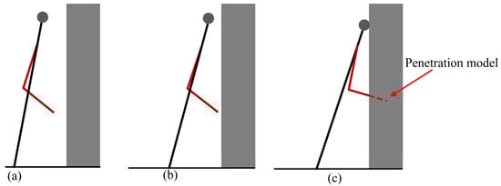 When a robot falls, the arms play a crucial role. For example, they can be used to adjust the body posture to balance or stabilize the robot’s body. During the falling process, the arms can be utilized to support the robot’s body or to push the robot to alter its motion state, avoiding more severe damage. This article uses the arms to reduce the impact when the robot lands, while also balancing and controlling the robot’s body. Currently, research on robots falling against walls and placing their arms on walls is mainly report in [,]. They used the maximum stiffness ellipse method to determine the pose of the robot arm. The problem with this method is that when the robot body has already fallen to a certain position, the arms will undergo a phenomenon of penetrating the model in order to reach the optimized angle value, as shown in Figure 5c. To address this issue, this article uses a multiple contact planning method to reduce the damage to the robot.