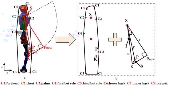 When the robot is standing, connecting these potential contact points on the robot’s body forms a polygon, as shown in Figure 6. These contact points include forehead, chest, palms, forefoot soles, hind-foot soles, lower back, upper back, and occiput, and so on. The length and direction of the sides of this polygon can change. Taking the example of a robot falling forward and reaching out to a wall for support, when the fall was detected, the lower body of the robot begins to squat downward. Compared to other contact points, the knee point K was the first to approach the ground. We expect that once the robot’s knee reaches the set reference value, the end of the arm should also touch the wall. Therefore, a trajectory needs to be found for the arm to reach the nearest point. By observing Figure 6a, it can be seen that in the sagittal plane, the workspace of the arm forms a circular area with the upper arm joint as the center and the arm length as the radius. If both the knee and arm need to reach the set reference positions at the same time, the optimal path for the arm is perpendicular to the tangent line passing through the knee point K, as shown in in the figure.