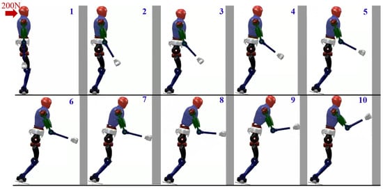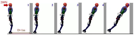 At the beginning, we applied a forward force of 200 N and a last time of 0.2 s on the robot’s head. The detection of whether the robot would fall and the direction of the fall were determined based on reference []. The distance D between the robot’s ankle and the wall was provided in advance. In the simulation, the distance is 1 m. To validate the practical effectiveness of the proposed method, this study conducted several comparative simulations. The first simulation group involved the robot without any protective actions. In the second group, the robot generated leg joint trajectories solely using the variable height-inverted pendulum model. In the third group, the combination of the variable height-inverted pendulum model and the distributed polygon method was employed. Finally, the fourth group expanded upon the third group by incorporating whole-body motion control.
