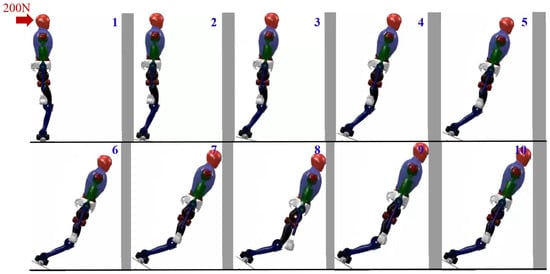 By employing a variable height-inverted pendulum model and model predictive control, we obtained the state variables X of the robot. Using inverse kinematics, we acquired the joint angles of the robot’s legs. The resulting schematic diagram of the robot’s motion is shown in Figure 9. From this, we can observe that without arm support, the robot lowers its center of mass to reduce the impact velocity. As a result, the soles of its feet do not fully contact the ground, indicating a potential tendency for the body to slide downward.