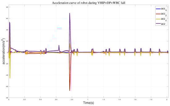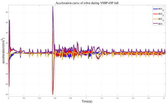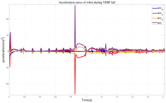 We obtained the impact acceleration when the robot is descending, as shown in Figure 10. Analyzing the latter part, it can be observed that after the robot’s head reaches the wall, a secondary collision occurs between the body and the wall, with a relatively smaller collision velocity, and the maximum acceleration is 141.96 m/s2.