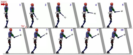 Simulation 2 presents the motion trajectory of the lower body of the robot when utilizing the variable height-inverted pendulum model. From the above figure, it can be observed that the robot almost collapses on the wall during the descent. However, the main focus of this study is the magnitude of the acceleration and balance effect when the robot lands on the wall. In this section, motion control of the arms has been incorporated, and the final result is shown in Figure 11. We can observe that during the robot’s motion, the heel exhibits a phenomenon of being off the ground. Additionally, after the arms make contact with the wall, they undergo a sliding motion along the wall, which in turn affects the movement of the waist joint, as shown in sequences 7, 8, and 9 of Figure 11.