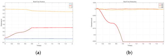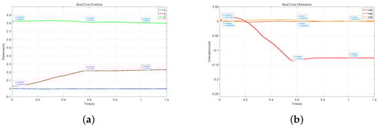 In the initial stage, the robot maintains a standing posture and is positioned 0.85 m away from the wall. We artificially applied a forward force to the robot, and at this point, the robot detects an imminent fall and immediately swings its arms forward, as shown in (2)–(7) of Figure 16. During the forward swing, the leg joints also rotate forward, as depicted in (8)–(11). Eventually, the robot reaches the wall and maintains a stable posture, as shown in (12)–(14). We obtained schematic representations of the robot’s center of mass position and Euler angles, as shown in Figure 17. Combining these two figures, we can observe that the vertical descent of the robot’s center of mass is about 0.02 m, while the forward displacement is 0.202 m, with a rotation angle of approximately 8.02°.
