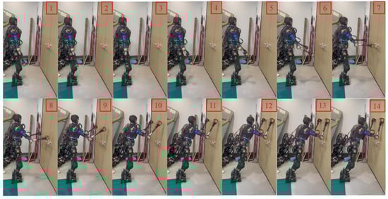In order to validate the adaptability of the proposed variable height-inverted pendulum model, distributed polygon, and whole-body motion control under different environmental conditions, we rotated the wall counterclockwise by 12° and observed the robot’s motion in this state. The final result is shown in Figure 13. It can be observed that during the robot’s motion, the feet maintain continuous contact with the ground. Compared to the method without the added motion control, the robot’s arms smoothly reach the wall without the aforementioned sliding motion causing waist joint deviation.