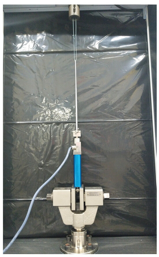 A universal testing machine (Autograph AGS-X, Shimadzu Corporation, Kyoto, Japan) with a load cell of 100 N was used to evaluate the probing sensor’s reliability. The universal testing machine was used to assess materials’ tensile and compressive strengths. The load cells used in this test were calibrated annually. Therefore, the values calculated by the universal testing machine were accurate. First, the handle of the probing sensor was fixed using a jig installed at the bottom of the universal testing machine; the probing sensor was set vertically. A loop was then made using a 2-0 Ethibond suture (ETHICON Inc., Bridgewater, NJ, USA). One end of the suture was hooked onto the tip of the probe, and the other end was attached to the jig of a universal testing machine to form a loop. Loads equivalent to 3.0, 5.0, and 10.0 N were applied to the probing sensor at a speed of 1.0 N/s by the universal testing machine via the 2-0 Ethibond suture (Figure 2). The tests were performed at least five times for each load. The tensile force the universal testing machine applied and the mean loads calculated from the device were compared. The intraclass correlation coefficient (ICC) of intraobserver reliability was computed using the load calculated from the device to demonstrate the reliability of the evaluation.