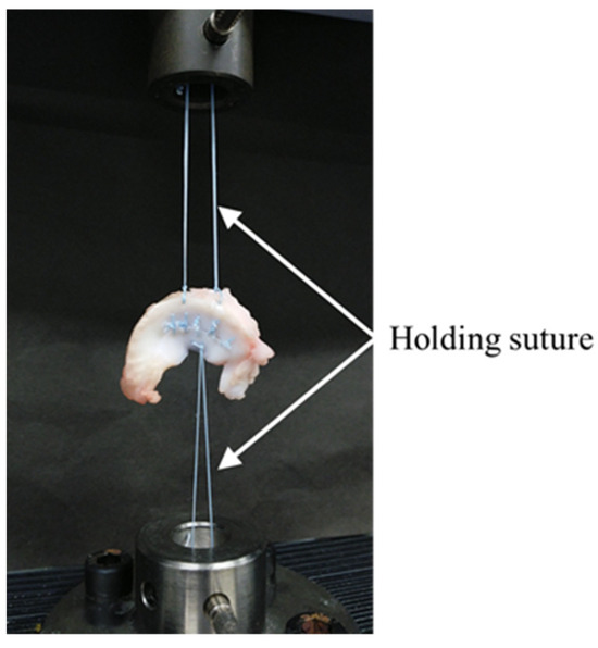 To investigate the relationship between the width of tear and displacement of meniscus during loading, a biomechanical test was performed using a universal testing machine with a cell load of 100 N to assess displacement during constant loading. Using the porcine meniscus sample with a 2.5 mm tear width, retention sutures (2-0 FiberWire) were hooked at two locations on the meniscal rim and one at the center of the inner edge; a loop was formed. The looped suture was attached to the pin of the universal testing machine jig to form a loop, and the outer and inner rim sutures were placed on the upper and lower jigs of the universal testing machine, respectively. The biomechanical test was conducted under conditions where a preload of 0.1 N was applied, and the load was applied at a speed of 30 mm/min until 10 N was reached (Figure 4). Displacement was calculated after reaching 10 N.