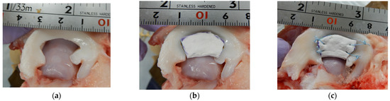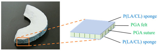 The meniscal scaffold comprised polyglycolic acid (PGA) and L-lactide-ε-caprolactone copolymer (P(LA/CL)). This novel scaffold was manufactured using PGA felt (NEOVEIL®; Gunze Medical Ltd., Osaka, Japan) coated with a P(LA/CL) sponge fixed using PGA sutures (Gunze Medical Ltd., Osaka, Japan). PGA laminate was immersed in a solution of copolymer (polyester with a 50:50 molar composition of lactate and ɛ-caprolactone) in 1,4-dioxane and freeze-dried (DRZ350WA; ADVANTEC Co, Ltd., Tokyo, Japan). The inner PGA laminate and outer sponge layers were approximately 6 to 6.5 mm and 100 to 400 µm thick, respectively. The scaffold was trimmed to form the final C-shaped scaffold, with the average size of the meniscus in the porcine specimen: diameter, 40 mm; body width, 15 mm (Figure 5) [25,26].