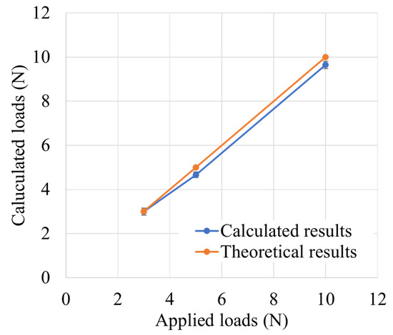 A universal testing machine applied loads equivalent to 3.0, 5.0, and 10.0 N to the probing sensor using the 2-0 Ethibond suture, resulting in a calculated load of 2.99 ± 0.16, 4.66 ± 0.13, and 9.64 ± 0.17 N from the probing sensor, respectively (Figure 7). The loads applied by the universal testing machine and those calculated by the probing sensor correlated with each other, with an ICC of 0.99.
