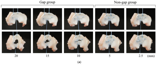 Biomechanical testing was performed using a universal testing machine to investigate the relationship between the width of the unsutured meniscal scaffold and the presence or absence of a gap. Using the samples evaluated in Section 2.4.2, installation on a universal testing machine, tensile testing, and calculation of test data were performed using the same process described in Section 2.3.2. After testing with a suture fixation width of 2.5 mm, displacements were also calculated for suture fixation widths of 5, 10, 15, and 20 mm, as described in Section 2.3.2 (n = 5). For each test, images were captured before and after the test using a digital camera, and the gap and non-gap groups were defined based on the presence or absence of a gap in the unsutured area.