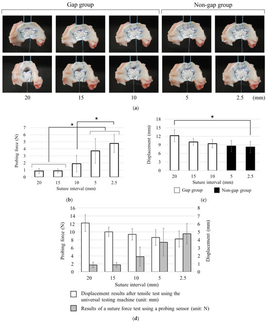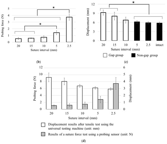 (a) Macroscopic images of each suture interval in biomechanical test. The upper row is an image before the test; the lower row is an image after the application of a 10 N load. (b) The results of a suture force test using a probing sensor after suturing a porcine meniscus (n = 5). (c) Displacement results after tensile test using the universal testing machine (n = 5). (d) The results show (b,c) side by side at each suture interval. Data are presented as average value ± SD. ✶ indicates a statistically significant difference (p < 0.05).