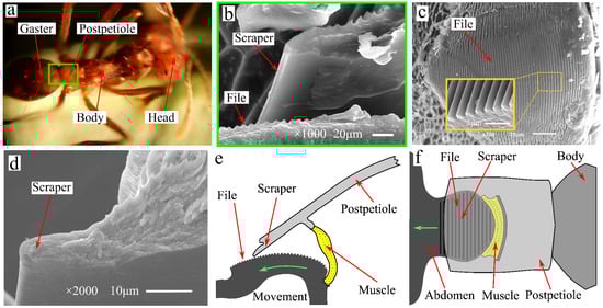 Leaf cutting ant and excitation organs. (a) Atta cephalotes, (b) excitation organs of leaf-cutting ant, (c) the file and teeth, (d) the tip of the scraper, (e,f) Structure diagram of excitation organs.