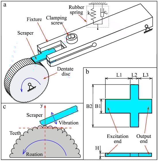 As shown in Figure 2a, this BUV includes a scraper, dentate disc, and fixture system and belongs to a class of mechanical ultrasonic excitation devices. As shown in Figure 2b, the scraper has a cross-shaped structure and is divided into excitation and output ends. As shown in Figure 2a,c, the dentate disc is analogous to the file structure of the leaf-cutting ant, with uniformly distributed micro teeth on its outer cylindrical surface and a tooth count of z0. The fixture system included two parts: a rubber spring and a fixture. The fixture clamped the scraper with a clamping screw and was connected to the main frame using a pin to form a rotating pair. Using a rubber spring, a preload force can be applied to the fixture, denoted as F0. The fixture system forms a low-frequency mass-spring damping system, and this system can adaptively adjust the spatial position relationship between the dentate disc and the scraper. This fixture system ensures the relative position relationship between the scraper and dentate disc and has a rotational degree of freedom.