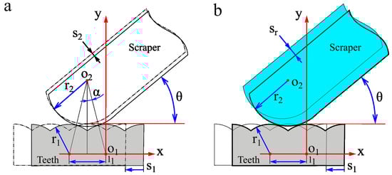 First, the simple situation shown in Figure 3a was calculated. Owing to the small geometric dimensions of the teeth, the circular arc through which the teeth rotate near the tip of the scraper can be simplified as a straight line, denoted as s1. A Cartesian coordinate system was established, with the center of the tooth arc as the origin and the opposite direction of tooth motion in the positive x-axis direction. The mechanical factors of the scraper were ignored, and the scraper and dentate disc were assumed to maintain continuous contact. Based on the geometric relationship between the scraper and the dentate disc, the displacement s2 of the scraper movement can be calculated.