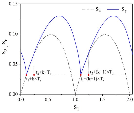 Combining Equations (2)–(4), s2 can be calculated using s1, and the graph of s2 changing with s1 is shown in Figure 4. To illustrate the relationship between s2 and sr, a possible scenario for sr is plotted in Figure 4. As the tip of the scraper may not always be in contact with the dentate disc, the following relationship holds: