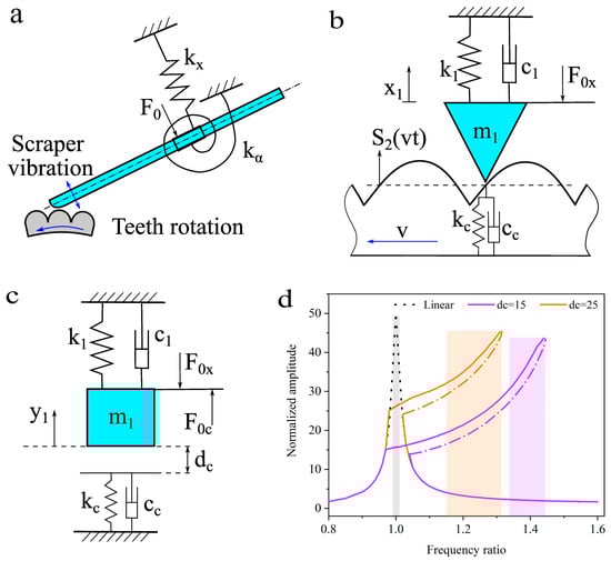The transformed vibration model is shown in Figure 5c, this is a forced excitation single-degree-of-freedom vibration model with asymmetric piecewise-linear characteristics. This vibration model belongs to a class of nonlinear systems with non-smooth factors that were caused by the periodicity contact between the dentate disc and scraper. Similar single-degree-of-freedom asymmetric piecewise-linear vibration models have been profoundly studied [,,], and researchers have demonstrated that these nonlinear models can generate primary, subharmonic, and superharmonic resonance phenomena. Additionally, the primary resonance frequency and the natural frequency of the linearly derived system are different [,].