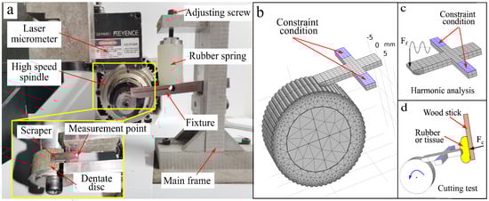 According to Table 3, the material parameters were set and the multi-body dynamics module was added as the physical field for calculation. Considering the actual contact situation between the scraper and the fixture, elastic constraints were set on the surface of the contact part between the scraper and the fixture to simulate the actual constraint situation of the scraper in the experiment and ensure computational efficiency. The elastic constraint parameters were obtained through the modal parameter identification method. In the simulation model, the constraint stiffness parameter was set to 3 × 107 N/m, and the damping parameter was set to 1 × 102 s/m. The damping of the scraper material was set using the Rayleigh damping model, α = 1522.42, β = 1.93 × 10−7. The grid was divided as shown in Figure 6b. A modal solver was added to calculate the vibration mode of the scraper. Then, a harmonic excitation force was set at the excitation end, and a frequency domain solver was added to calculate the harmonic response of the scraper output end. In order to investigate the dynamic process of tooth scraping on the blade excitation, a simplified finite element model was established, as shown in Figure 6b. On the basis of modal analysis of the finite element model, we added the dentate disc component. We established a geometric model of the dentate disk based on the corresponding parameters, defined the contact relationship between the scraper and the dentate disc through a penalty function, and set the contact friction coefficient to 0.02. Due to the initial preload force F0 of the damping spring on the fixture during the experiment, the scraper underwent elastic deformation. To simplify the calculation model, the initial displacement y0 = 0.3 mm of the dentate disc rotation center was set. The rotation speed of the dentate disc was set according to the tooth frequency. The transient solver was added, and the maximum time step was set to 5 µs, so that the calculation time step was less than 10% of the vibration period, to ensure calculation accuracy.