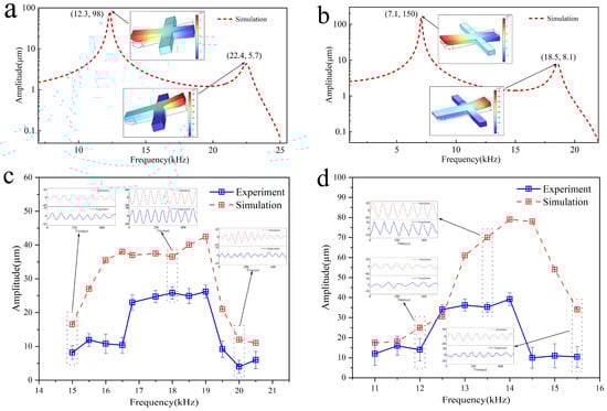 Furthermore, finite element calculations and experimental measurements were conducted on the vibration characteristics of the Sb scraper blades at different tooth excitation frequencies. The results are shown in Figure 7d. Finite element calculations show that stable vibrations can be generated at the output end of the scraper blades when the tooth excitation frequency is in the range of approximately 16–19.2 kHz. The vibration frequency is equal to the tooth excitation frequency, and the vibration amplitude is approximately 35–45 µm. The experimental measurement results show that when the tooth excitation frequency is in the range of approximately 16.8–19 kHz, stable vibration could be generated at the output end of the scraper. The vibration frequency was equal to the tooth excitation frequency, and the vibration amplitude was approximately 22–25 µm. Compared to the simulation results, during the experimental process, the blade vibration frequency bandwidth was smaller, and the vibration amplitude was relatively smaller. This is also owing to the neglect of the manufacturing error of the tooth plate in the finite element model, which makes the vibration of the scraper blade unaffected by the eccentric motion of the tooth plate.