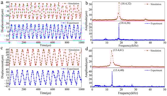 When the excitation tooth frequency was 13.4 kHz, the Sa scraper generated a stable vibration displacement. The amplitude of the vibration displacement in the simulation results was approximately 61 µm, while in the experimental measurement results, the vibration displacement was approximately 40 µm, as shown in Figure 8c. Similar to the results of Sa scraping, the vibration displacement generated during the experiment was relatively small, which may be due to the machining error of the tooth disk, causing the rotation center to shift. A spectral analysis was performed on the vibration displacement obtained from the simulation and experiment, as shown in Figure 8d. The spectrum curve has an obvious main peak corresponding to a frequency of 13.4 kHz, which is equal to the tooth excitation frequency. Except for the main peak, all the other peaks were relatively small, indicating that the vibration displacement was close to a single component of the harmonic vibration.