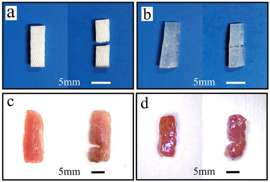 In order to test the load-carrying capacity of the BUV, the load-carrying capacity test was conducted, as shown in Figure 6d. Four test materials, rubber (Ecoflex 00-30), rubber (Ecoflex 00-10), pig muscle tissue, and pig liver tissue, were used in these tests. The muscle and liver tissues of pigs were fresh ex vivo. The test materials were prepared in advance as a rectangular shape of approximately 15 mm × 5 mm × 3 mm. Approximately 1-N force was applied using a wooden strip to press the rubber against the scraper’s output end. The scraper-cutting test was conducted separately with and without ultrasonic vibration, and the results were compared and analyzed.