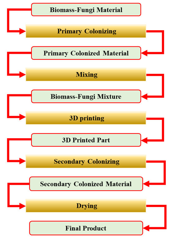 Utilizing 3D printing-based manufacturing methods [12] to produce products using biomass-fungi composite materials present an alternative to conventional molding-based manufacturing methods. Three-dimensional printing-based manufacturing methods enable the production of complexly shaped products in art, interior design, packaging, architecture, and construction [13,14,15,16], which are challenging to produce using molding-based manufacturing methods. The processes of one 3D printing-based manufacturing method are shown in Figure 1 and briefly described below.