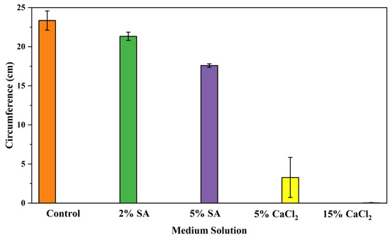 Table 2 shows pictures of Petri dishes prepared for different test conditions by following the procedure described in Section 2.1.4. The data on circumferences of the fungal colonies in these Petri dishes are presented in Figure 3. The error bars in the figure represent 95% confidence intervals of the means. The day 0 mean circumference was displayed as 0 cm in Table 2 for all the Petri dishes, and if there was no growth at 3 or 5 days, it was also indicated as 0 cm circumference. The control Petri dishes had the highest fungal growth (circumference = 23.34 cm). The 2% SA Petri dishes had significantly lower fungal growth (p-value = 0.004 < 0.05) than the control Petri dishes. The 5% SA Petri dishes also had significantly lower fungal growth (p-value = 0.0001 < 0.05) than the control Petri dishes. The 2% SA Petri dishes had significantly higher fungal growth (p-value = 0.0001 < 0.05) than the 5% SA Petri dishes. In summary, among the tested conditions, the addition of SA into Petri dishes reduced fungal growth. The results are consistent with the results reported by Jung et al. [42], who found that chitosan and SA multilayer coatings inhibit fungal growth. Tøndervik et al. [43] demonstrated the antifungal properties of an oligosaccharide, an alginate derived from seaweed.