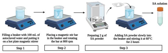 The preparation procedure of the SA solution with the concentration of 2:100 (2SA) (w/v) is illustrated in Figure 6 and described below [28,53].