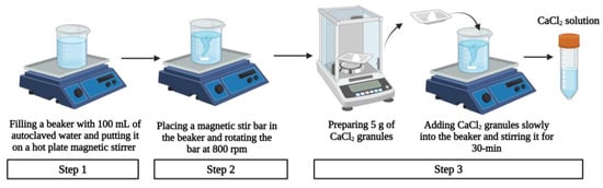 The preparation procedure of the CaCl2 (crosslinking) solution with the concentration of 5:100 (w/v) [54,55] is illustrated in Figure 7 and described below [28].