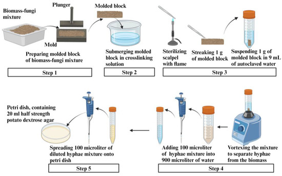 Step 3: A sharp scalpel was first flame-sterilized using a gas burner until glowing red and was allowed to cool for 15 s. The spatula was used to gently streak a mass of one gram of biomass-fungi mixture from each block prepared in Step 2. Then, this mass was immediately suspended in a falcon tube containing 9 mL of autoclaved water.