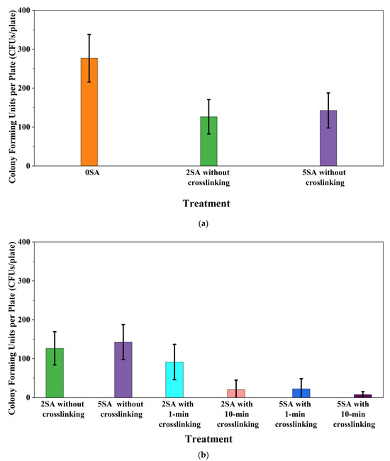 Colony Forming Units per plate (CFUs/plate) based on different treatments, (a) 0SA vs. 2SA and 5SA without crosslinking plated samples, (b) 2SA and 5SA without crosslinking vs. with crosslinking plated samples.