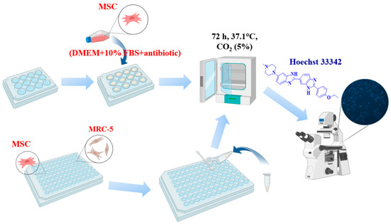 Sterile cover glasses with a diameter of 1 cm were placed in a 12-well plate, onto which powder samples were evenly applied in a thin continuous layer. The samples were then incubated with 50 µL of culture medium to obtain a dense layer. MSCs and MRC-5 cells were seeded at a density of 10 × 103 per 100 mL/glass in medium (DMEM + 10%FBS + antibiotic/antimycotic). After 24 h, 1 mL of cellular medium was added, and the cells were incubated for 3 days. Analysis of cell number and viability was determined using fluorescent dyes Hoechst 33342 (a fluorescent DNA intercalating dye that stains the nuclei of all cells) and PI (stains only the nuclei of dead cells). Cells were analyzed by fluorescence microscopy (Zeiss, Axio observer Z1, Oberkochen, Germany). The acquired images were processed using ZEN blue software (ZEN3.1. blue edition) (Zeiss, Oberkochen, Germany) (Figure 1).