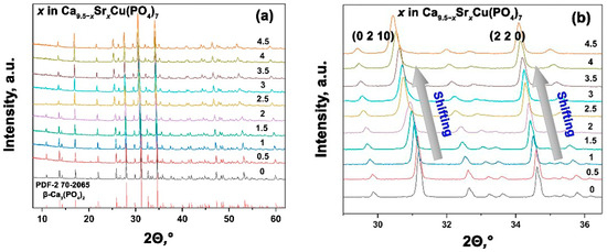 The PXRD patterns of synthesized Ca9.5–xSrxCu(PO4)7 0 ≤ x ≤ 4.5 solid solutions are presented in Figure 2a. The data analysis revealed that all the powder samples belong to the β-TPC structural type. No impurities from either the apatite type or pyrophosphate phases were detected, which confirms a complete reaction. In [37], the maximum doping concentrations of both Cu2+ and Sr2+ ions were ~ 2.52 mol.%. The absence of impurity phases confirmed the complete incorporation of these ions into the β-TCP structure, represented by the formula Ca9.97Sr0.265Cu0.265(PO4)7, as determinate by elemental analysis [37]. In the single Sr2+-doped solid solution Ca10.5–xSrx(PO4)7 [31], the limit of Sr2+ substitution before a structural change was determinate to be x = 6, corresponding to Ca4.5Sr6(PO4)7. According to our results, the reduction of the unit cell caused by Cu2+ incorporation does not hinder the formation of single-phase solid solutions throughout the studied range in Ca9.5–xSrxCu(PO4)7 (0 ≤ x ≤ 4.5).