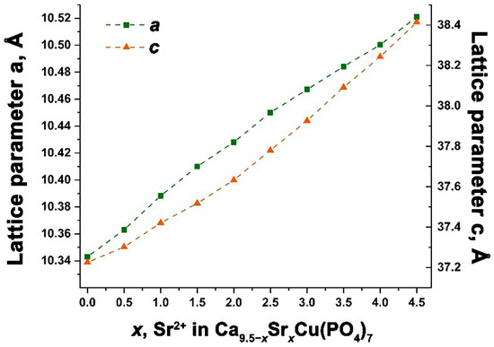 The calculation of the unit cells parameters a, c and the volumes V is consistent with the Vegard’s law. This suggests the creation of a continuous series of solid solutions Ca9.5–xSrxCu(PO4)7, confirming the intended isomorphic substitution (Figure 3). The precise values of the elementary cell parameters are detailed in Table 1.