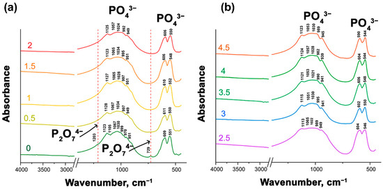 Figure 4a,b shows the FT-IR spectra of Ca9.5–xSrxCu(PO4)7. All the presented spectra are very similar. Absorption bands of PO43– groups are noticeable in all spectra. The vibrational modes in the phosphate stretching and bending regions appear in the range of 939–999 cm−1 for ν1s, 1128–1021 cm−1 for ν3as and 611–544 cm−1 for ν4 [38]. However, transmission peaks at 1203 and 729 cm−1 were identified in Ca9.5Cu(PO4)7. These low-intensity bands suggest the presence of the ν [P–O–P] from P2O74–. However, the PXRD patterns did not show reflections attributed to the pyrophosphate phase, its amount being below the sensitivity level of the instrument. Thus, P2O74– ions likely do not significantly contribute to the properties.