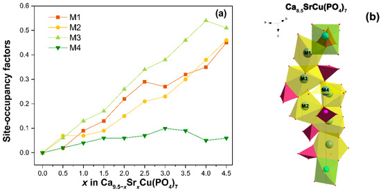Firstly, the occupancies of the crystal sites were refined. Cu2+ ions were determined to occupy the smallest octahedral M5 site due to the value of the ionic radii (rVI = 0.73 Å). Next, Ca and Sr atoms were randomly placed over the M1–M3 sites. Their occupancies (ai) were refined with total occupancy restrained to unity. For the M4 site, the occupancy was restricted to a value of 0.5 [7]. According to the refinement, Sr2+ with ionic radii (rVIII = 1.26 Å) [39] primarily locate in the M1–M3 sites, while in the M4 site, ai(Sr) does not exceed 0.1 (Figure 5a). Our results are in a good agreement with the literature data from [37], which refined the chemical formula to Ca9.632Sr0.497Cu0.371(PO4)7 (or β-Ca2.752Sr0.142Cu0.106(PO4)2), and noted the occupancy of the M4 site by Sr2+ ions as 0.110. Further increases in the Sr2+ ion concentration results in its distribution through M1–M3, with a preference for the M3 site. This same trend of Sr2+ location was observed in the single-doped solid solution Ca9.5–xSrxCu(PO4)7 [31].