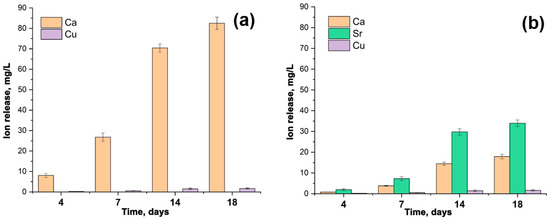 The accumulative release amount of Ca2+, Cu2+, and Sr2+ from Ca9.5–xSrxCu(PO4)7 samples after soaking in Tris-HCl buffer solution is shown in Figure 6. After 18 days of soaking, the release of Cu2+ from the samples exhibits roughly a linear dependency (Figure 6). The amount of Cu2+ ion released reaches 1.7 mg/L. There is no significant difference between the Ca9.5Cu(PO4)7 (Figure 6a) and Ca5Sr4.5Cu(PO4)7 (Figure 6b) samples in the value of the released Cu2+. The notably lower concentrations of Cu2+ in the soaking solution, compared to Ca2+ and Sr2+ ions, are related to its site-selective arrangement in the smallest octahedral M5 site, as proposed by us in [12], and according to crystal structure refinement. The placement of Sr2+ in the voluminous M1O8–M3O8 and M4O6 polyhedra (Figure 5b) contributes to its high dissolution into the liquid. The measurements were repeated three times in each step.