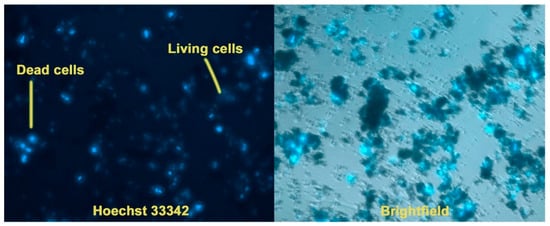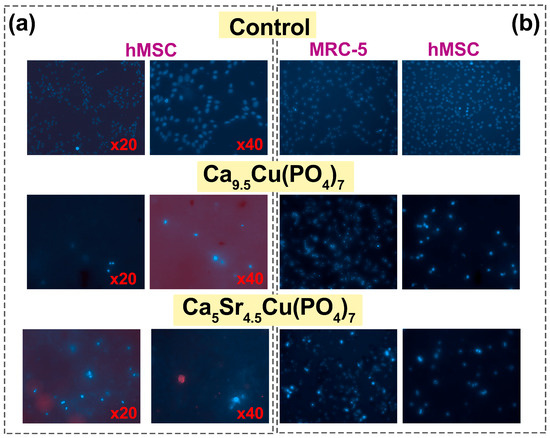 Staining with Hoechst 33342 dye makes it possible to determine the total number of cells, as well as to identify apoptotic cell nuclei. The tests were carried out on samples Ca9.5Cu(PO4)7 and Ca5Sr4.5Cu(PO4)7. When using the method of cell cultivation of hMSCs on a powder layer, it was observed that culturing cells on such a layer exhibited a highly cytotoxic effect, evidenced by the presence of individual dead cells after 3 days (Figure 7a). In the second case, it was observed that upon the addition of the studied powders, the proliferative activity significantly decreased, with the morphology of the nuclei indicating complete cell death for the Ca9.5Cu(PO4)7 sample, and partial death for Ca5Sr4.5Cu(PO4)7 (Figure 7b). Weakly stained cells with Hoechst 33342 dye remained viable, mainly located on the glass in the gaps between the blocks of powders (Figure 8).