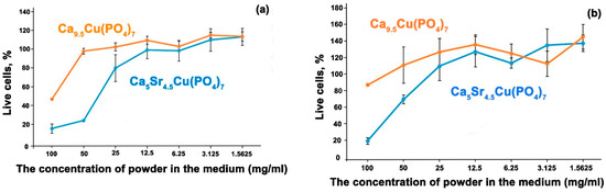 The MTT test demonstrated high toxicity of aqueous extracts of Ca5Sr4.5Cu(PO4)7 powder in maximum concentrations of 25, 50 and 100 mg/mL. Solutions of Ca9.5Cu(PO4)7 powder are less toxic (Figure 9a) even at 100 mg/mL concentration. It is interesting to note that solutions of Ca9.5Cu(PO4)7 exhibit a less toxic effect on osteoblasts, with concentrations exceeding 50 mg/mL showing a stimulating effect on osteoblast proliferation, significantly surpassing control values (Figure 9b). However, the presence of a large quantity of Sr2+ ions from the β-TCP structure in Ca5Sr4.5Cu(PO4)7 has a negative impact on the cells.