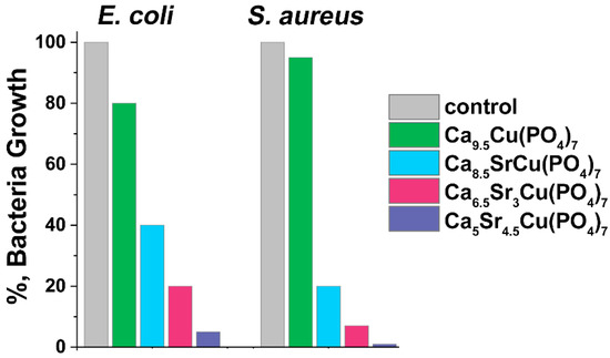 A significant reduction in bacterial growth was observed when x ≥ 1. In our previous study [16], it was suggested that active dopant ions distributed in various crystal sites of the β-TCP structure might augment antimicrobial efficacy. This could be due to the increase in possible concentration of dopant ions and the expansion of the unit cell, leading to a facilitated release of ions. The single-doped Ca9.5Cu(PO4)7 sample inhibits the growth of E. coli by 20%, while S. aureus shows lower susceptibility to this phosphate with only a 5% inhibition observed (Figure 10). The addition of Sr2+ ions to the β-TCP significantly increases its antibacterial activity. For instance, Ca8.5SrCu(PO4)7 inhibits E. coli growth by 60%, and S. aureus inhibition reaches 80%. A further increase in Sr2+ concentration in Ca9.5–xSrxCu(PO4)7 results in almost complete suppression of bacterial growth: 93% of inhibition for E. coli, and nearly a total reduction in S. aureus growth (Figure 10). Notably, according to the results, S. aureus is more sensitive to the presence of Sr2+ ions in the solution than E. coli, and almost indifferent to Cu2+ ions. In this study, Ca9.5–xSrxCu(PO4)7 exhibited a significant antibacterial activity related to a synergetic effect of Sr2+ and Cu2+ co-doping.