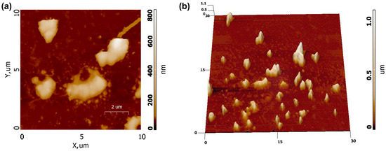 Figure 11 shows AFM scans obtained for a sample prepared according to the procedure described above. As can be seen, the particles of Ca9Sr0.5Cu(PO4)7 are inhomogeneously distributed on the substrate and are interconnected into agglomerates, as evident from the 3D scan map (Figure 11b). The linear dimensions of some of the largest particle agglomerates are about 2×3 μm with a height of up to 1 μm.
