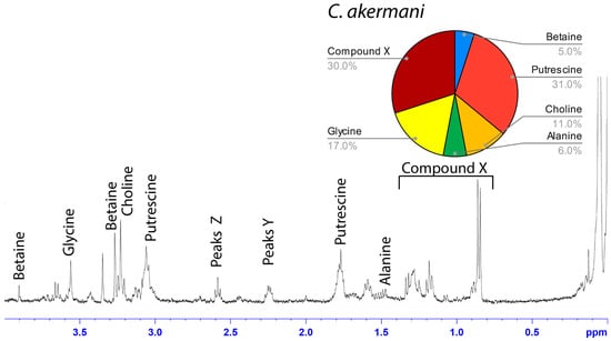 Among the moth specialists, we observed a high percentage of betaine (BET), N-acetyltaurine (NAT), glycine (GLY), putrescine (PUT), one unidentified compound we named Compound X (CMX), and two sets of peaks we referred to as Y and Z (PKY and PKZ). CMX occurred in only one generalist species, G. cancriformis, and at a much lower percentage than found in the specialists. PKY or PKZ occurred only in the specialists (Figure 7). CMX had a clear isopropyl group; through our COSY analysis, we observed the doublet at ~0.8 ppm coupled to a septet in the range of ~1.5 ppm (Figure S9). Further, the integration of the doublet and the septet were 1.00 to 0.13, respectively, allowing us to conclude that the doublet peak originated from an isopropyl group; thus, we could assign six protons to the doublet peak in our calculation of the relative percentage of CMX. Further, we estimated the molecular weight of CMX to be 100 g/mol in our relative abundance calculations by taking the average molecular weight of the known compounds in our spectra. PKY and PKZ did not have any distinguishing features in the NMR; we were unable to estimate their percentages in our samples and, thus, they are not visually represented (Figure 2, Figure 3, Figure 4, Figure 5, Figure 6 and Figure 7).