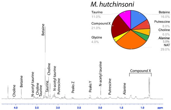 1H solution-state 400 MHz NMR spectrum of water-soluble LMMCs dissolved in D2O from the aggregate glue of M. hutchinsoni. The pie chart displays the relative abundance of each LMMC extracted from the aggregate glue. M. hutchinsoni contained taurine, which was absent in the other bolas spider, C. akermani.