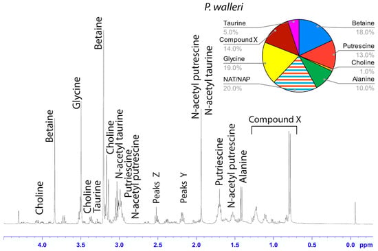 1H solution-state 400 MHz NMR spectrum of water-soluble LMMCs dissolved in D2O from the aggregate glue of P. walleri. The pie chart displays the relative abundance of each LMMC extracted from the aggregate glue. Due to peak overlap, we were not able to separately estimate NAT and NAP.