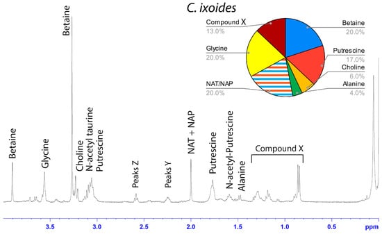 1H solution-state 400 MHz NMR spectrum of water-soluble LMMCs dissolved in D2O from the aggregate glue of C. ixoides. The pie chart displays the relative abundance of each LMMC extracted from the aggregate glue. Due to peak overlap, we were not able to separately estimate NAT and NAP.