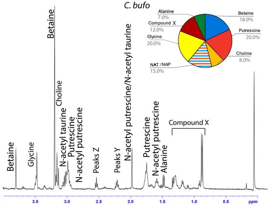 1H solution-state 400 MHz NMR spectrum of water-soluble LMMCs dissolved in D2O from the aggregate glue of C. bufo. The pie chart displays the relative abundance of each LMMC extracted from the aggregate glue. Due to peak overlap, we were not able to separately estimate NAT and NAP.