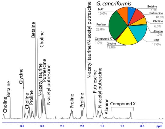 1H solution-state 400 MHz NMR spectrum of water-soluble LMMCs dissolved in D2O from the aggregate glue of G. cancriformis. The chart displays the relative abundance of each LMMC extracted from the aggregate glue. G. cancriformis was the only species to contain proline and the only generalist to contain traces of Compound X.
