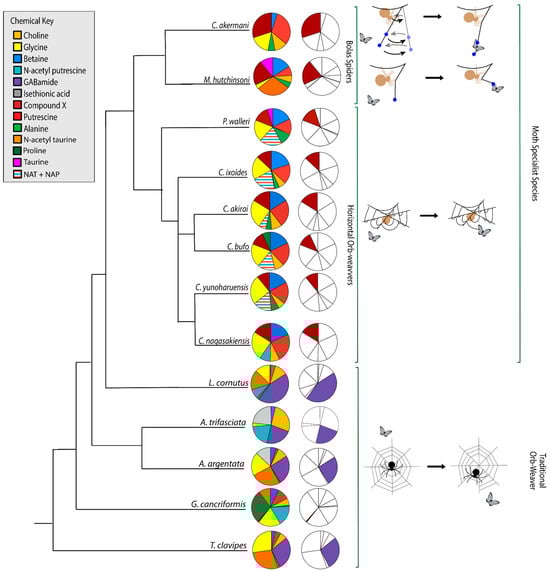Several studies have shown a range of organic LMMCs across generalist orb-weaver spiders using nuclear magnetic resonance (NMR) spectroscopic analyses [,,,,]. To date, only one study has shown the chemical distribution of organic LMMCs in a single moth-specialist species and it found novel unidentified peaks within its spectra []. Here, we used NMR spectroscopy to characterize and compare the biochemical diversity of LMMCs across eight moth-specialist spiders and five generalist spider species. We reconstructed the evolution of the individual LMMCs to examine if they correlated with the unique adaptive moth-catching behavior of some spiders. Thus, we tested the hypothesis that all moth-specialist spiders utilize a distinct novel chemical LMMC distribution along with the presence of at least one novel and previously unidentified LMMC when compared with generalist orb-weavers.