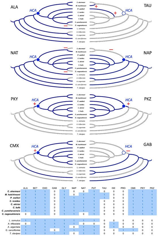 Character evolution of the LMMCs. Moth-catching specialists (taxa names in bold) form a monophyletic taxon, sharing a hypothetical common ancestor (HCA), with its variable character states reconstructed as either present (filled blue circle) or absent (empty blue circle). At or after that HCA, the evolution of a particular character state in the specialists occurs in one of three patterns: (1) loss (ALA, NAT, NAP, and GAB; red minus signs), (2) gain (PKY, PKZ, and CMX; red plus signs), or (3) convergence (TAU). Ancestral character states are reconstructed using simple parsimony, with absence indicated as a solid white line and presence indicated as a solid blue line; the one equivocal state at the root of the NAP tree is a combination of blue and white lines. The character × taxon matrix shows the coding of the characters as absent (0) or present (1) and includes all 14 LMMCs.