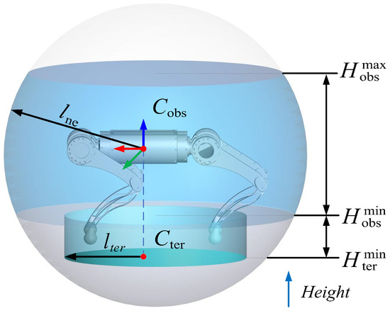 The purpose of the point cloud segmentation is to obtain the terrain and obstacle points in the neighborhood point cloud. The schematic segmentation diagram is shown in Figure 2. The neighborhood points of the robot are defined as points in a sphere with a radius of . The sphere is concentric with the center of mass of the robot’s torso. The obstacle points and terrain points are denoted by and , respectively. The obstacle points are defined as points within height from to in the sphere. The terrain points are defined as points within a cylinder with a radius of and a height from to . Attractive and repulsive forces are exerted on the robot by the terrain points, depending on the height of the point, to keep the robot’s body at a proper height. The detailed calculation is described in Section 4.