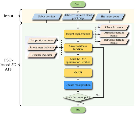In this section, firstly, the basic forms of attractive and repulsive potential field calculation for the 3D APF are illustrated, and the corresponding potential fields are calculated. Then, the parameters to be optimized in the 3D APF are illustrated. Finally, the fitness function, each indicator, and the proposed terrain complexity and improved path smoothness calculation method are introduced. The framework of the designed PSO-based 3D APF is shown in Figure 3.